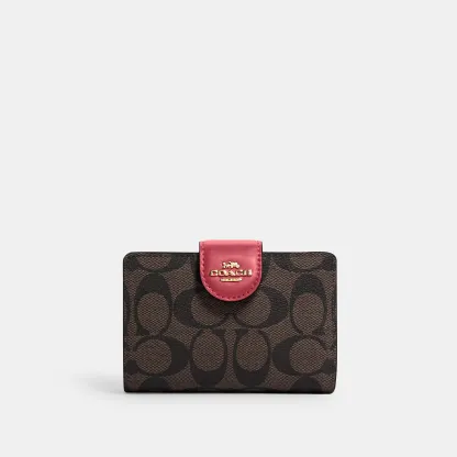 Signature coated canvas and smooth leather Seven credit card slots Bill compartment ID window Snap closure Zip coin pocket 5 (L) x 3 1/2 (H) x 1/2 (W) Style No. C0082