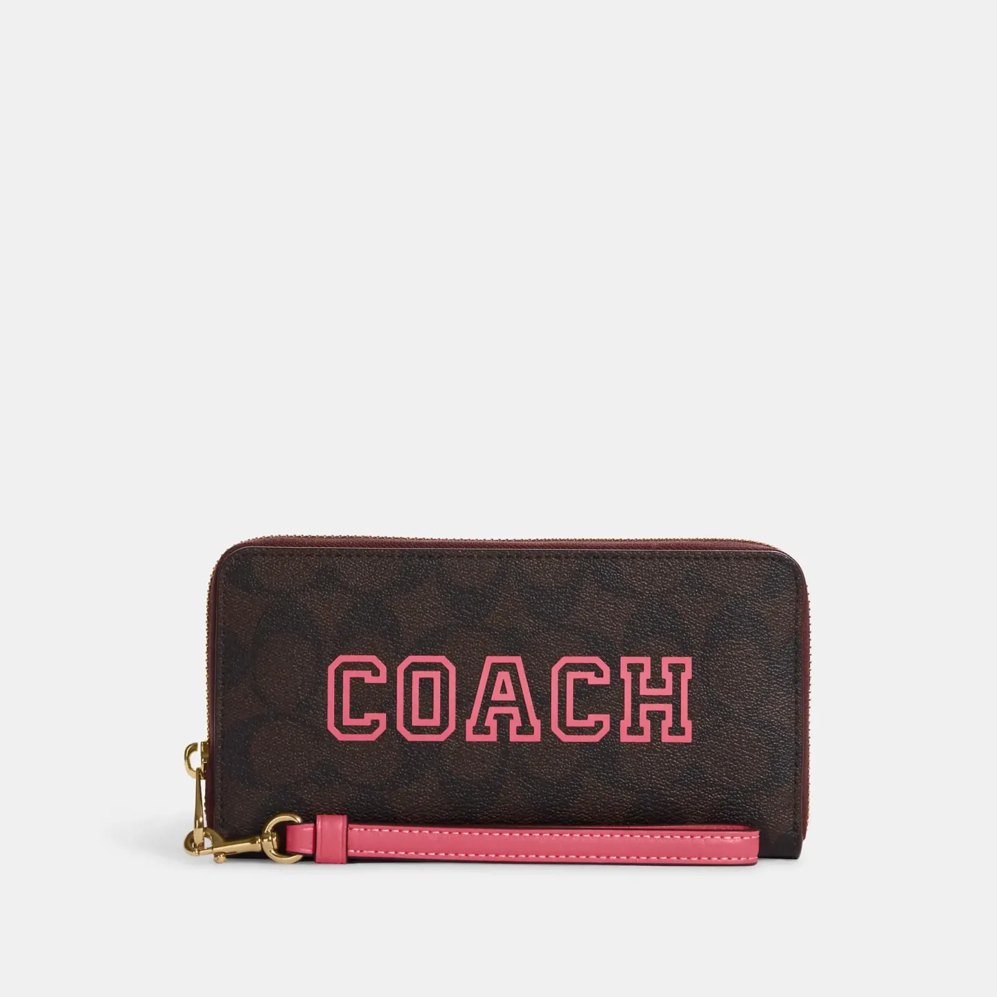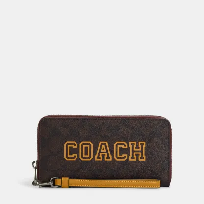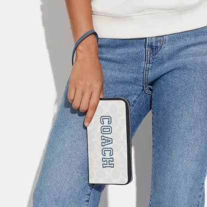 Signature coated canvas and smooth leather Twelve credit card slots Full-length bill compartments Inside zip coin pocket Zip-around closure Detachable wrist strap 7 1/2 (L) x 4 (H) x 1 (W) Fits all iPhone and Samsung Galaxy phones Style No. CB856