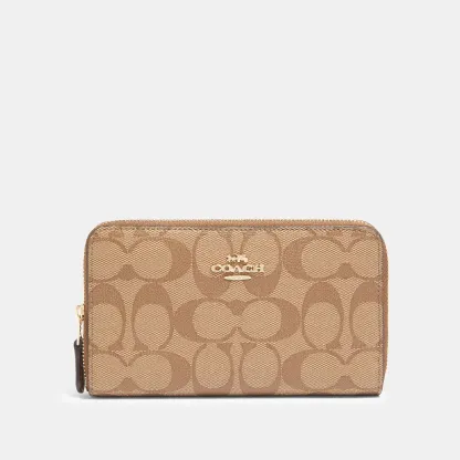 Signature coated canvas Eight credit card slots Bill compartments ID window Zip coin pocket Zip-around closure 6 1/2 (L) x 3 3/4 (H) x 3/4 (W) Style No. F88913
