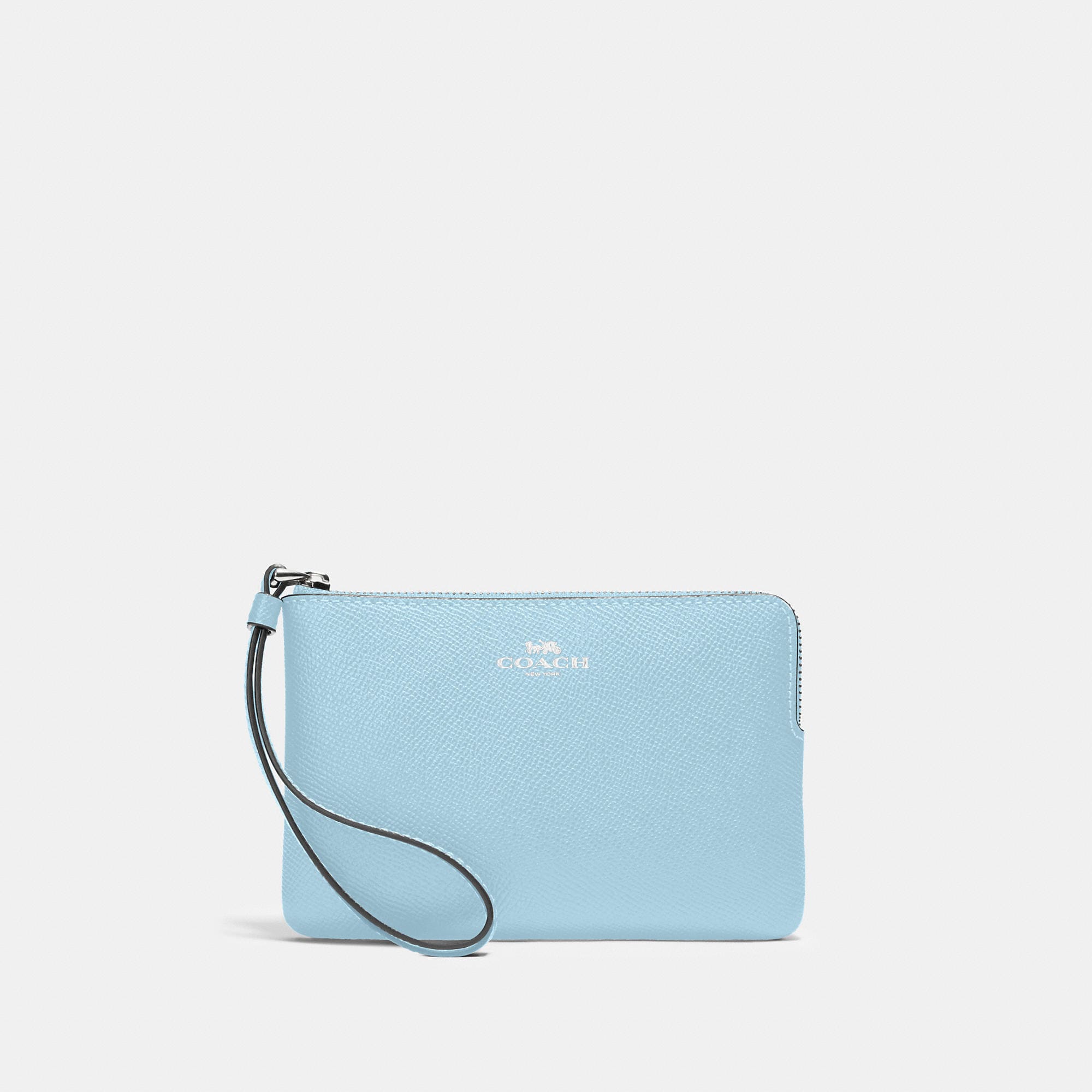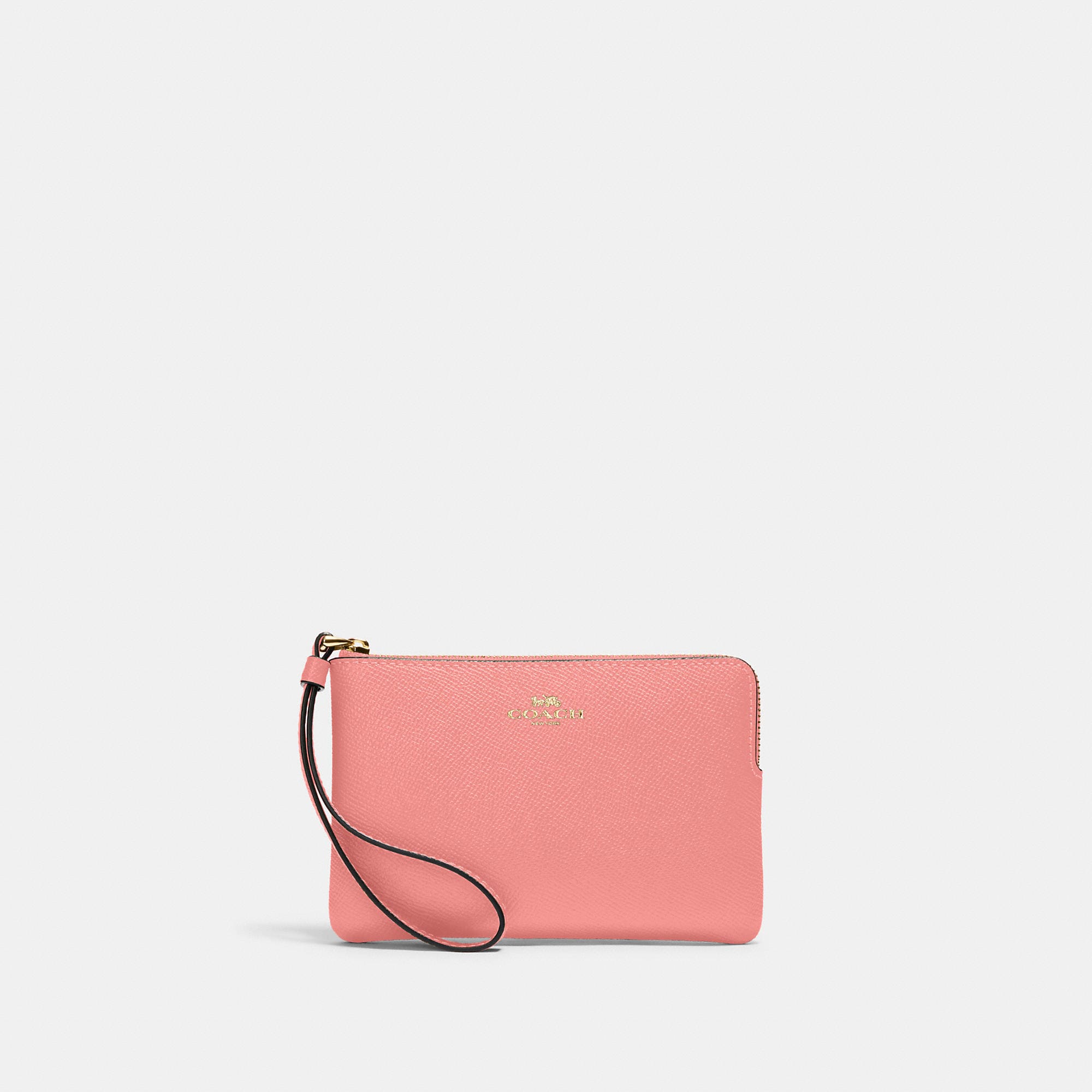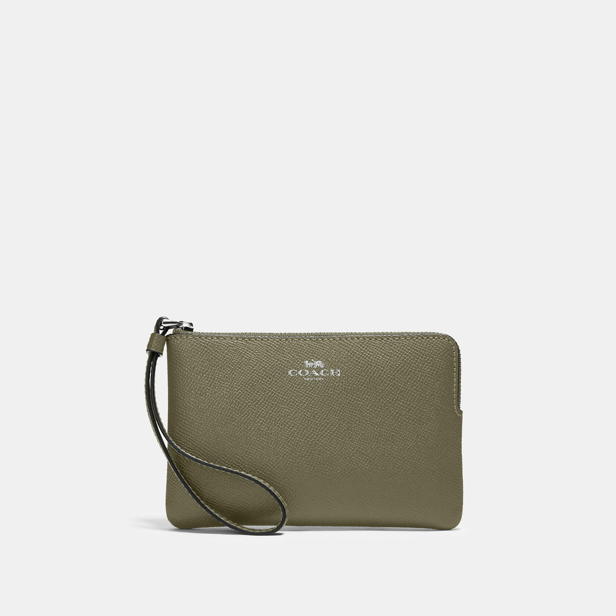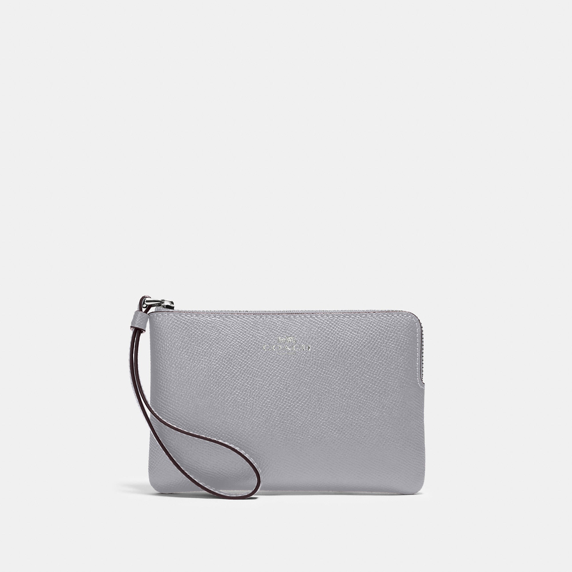 Crossgrain leather Two credit card slots Zip-top closure fabric lining Wrist strap attached 6 1/4 (L) x 4 (H) x 1/2 (W) Style No. 58032