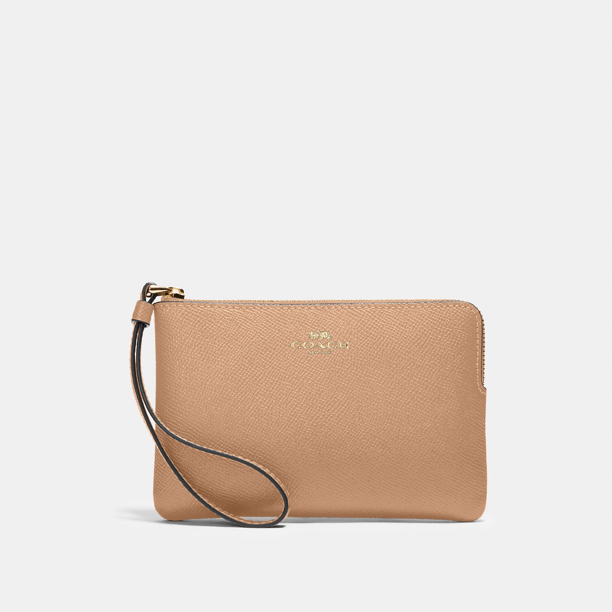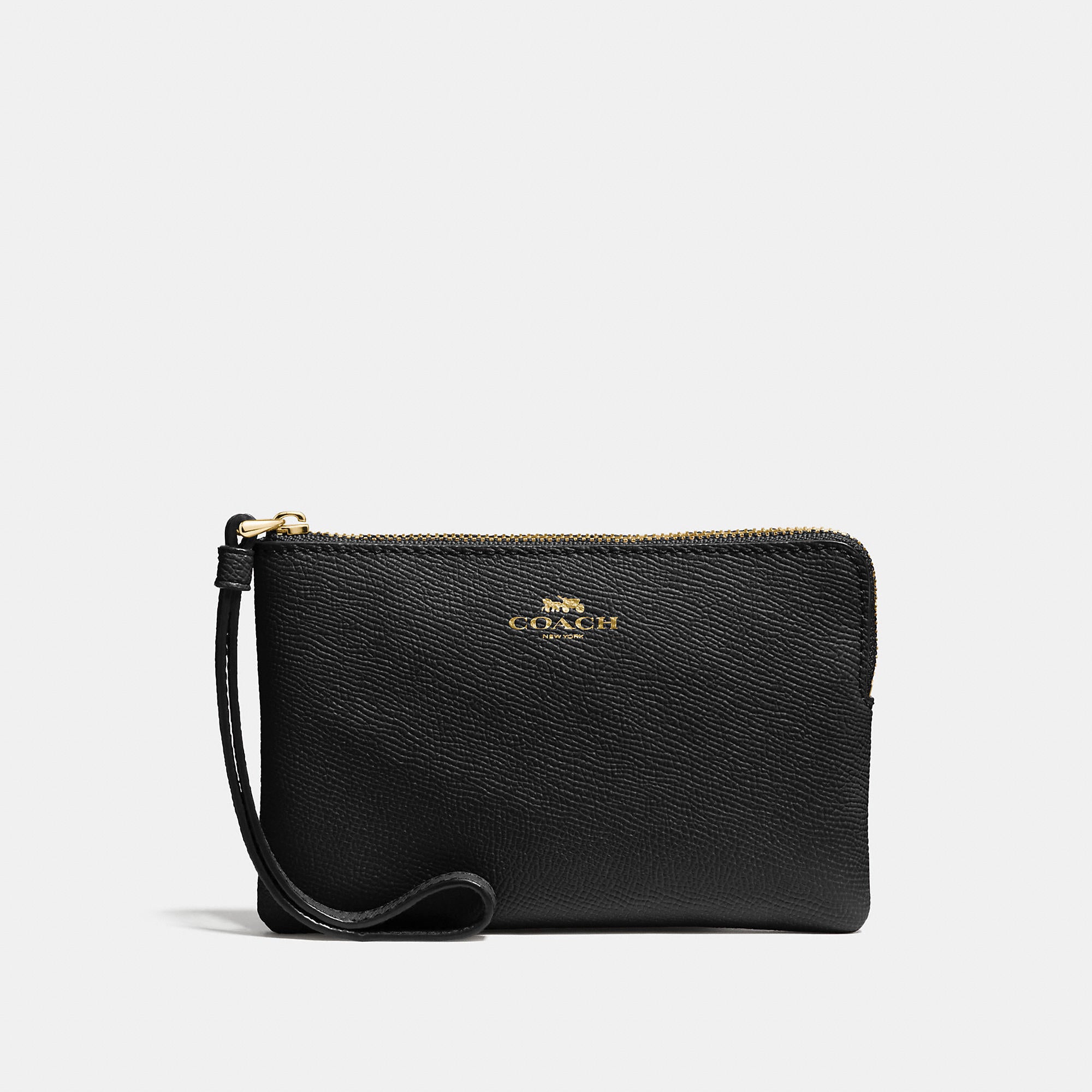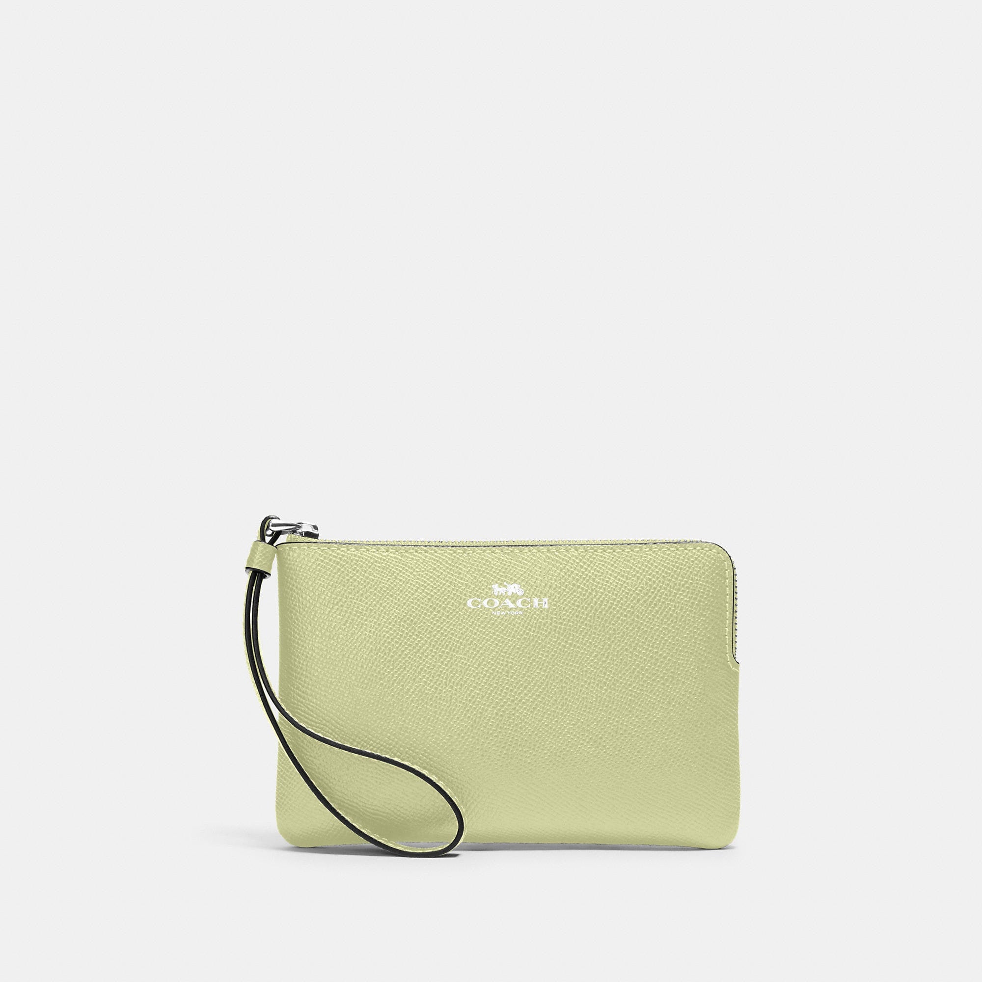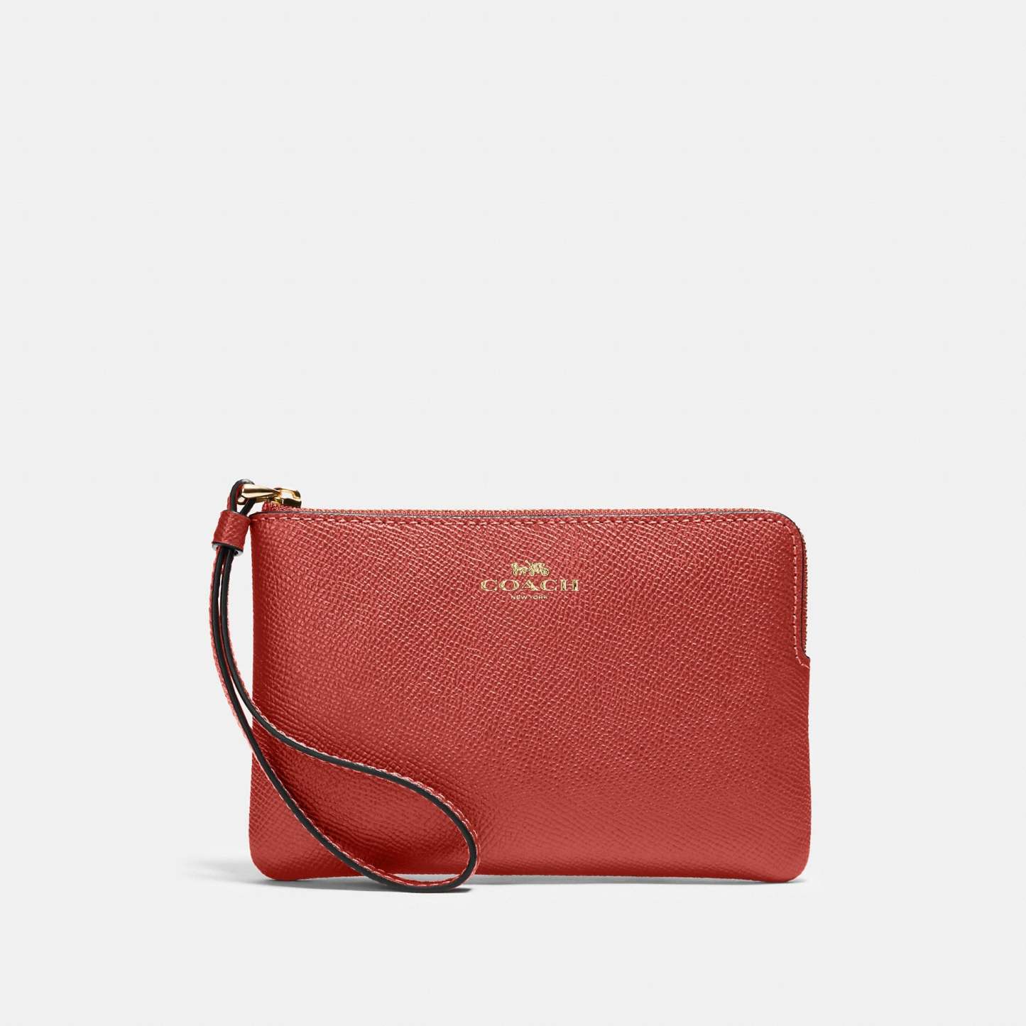 Crossgrain leather Two credit card slots Zip-top closure fabric lining Wrist strap attached 6 1/4 (L) x 4 (H) x 1/2 (W) Style No. 58032